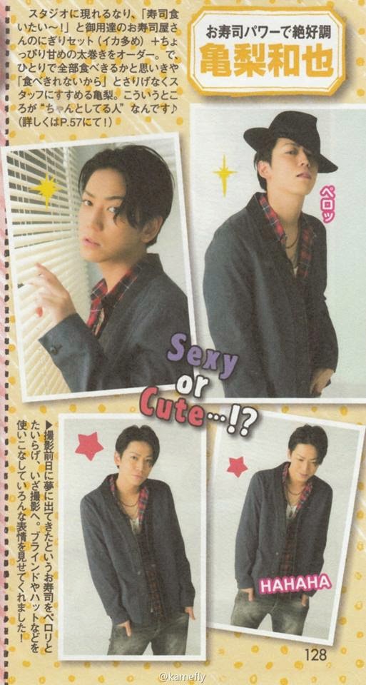 Épp Kame Wink Up-os képeit nézegettem, mikor megszólalt a tűzriadó. (ez nálunk évente 1-2 x van ilyen gyakorlat) Gondolhatjátok, mi volt az első reakcióm. Lehet Kame indította be a tűzriadót? Nem tudom, de a képei kib..ul és rohadtul jók! Szemébe lógó sérója - nálam - nagyon sexi!!! És még ott bujkál a félmosoly a szája szegletében, na most elvesztem és már nem is melózóm többet. Nem tudom , hogy a való életben milyen Kame, mert írásai nagyon szimpatikusak a Maquia magazinban!